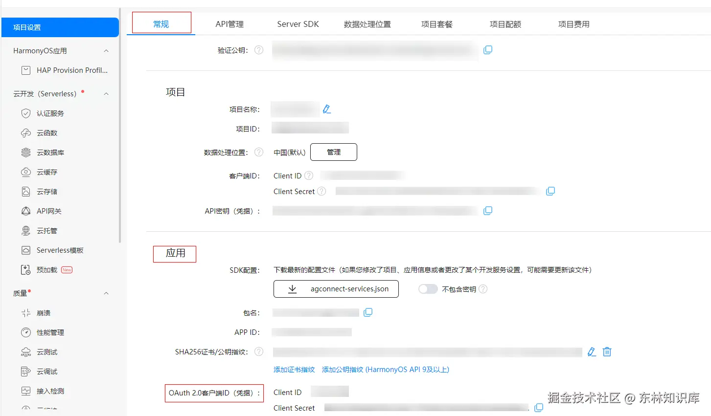 登录AppGallery Connect平台,在“项目设置 > 常规 > 应用”区域获取“OAuth 2.0客户端ID(凭据)”处的Client ID。