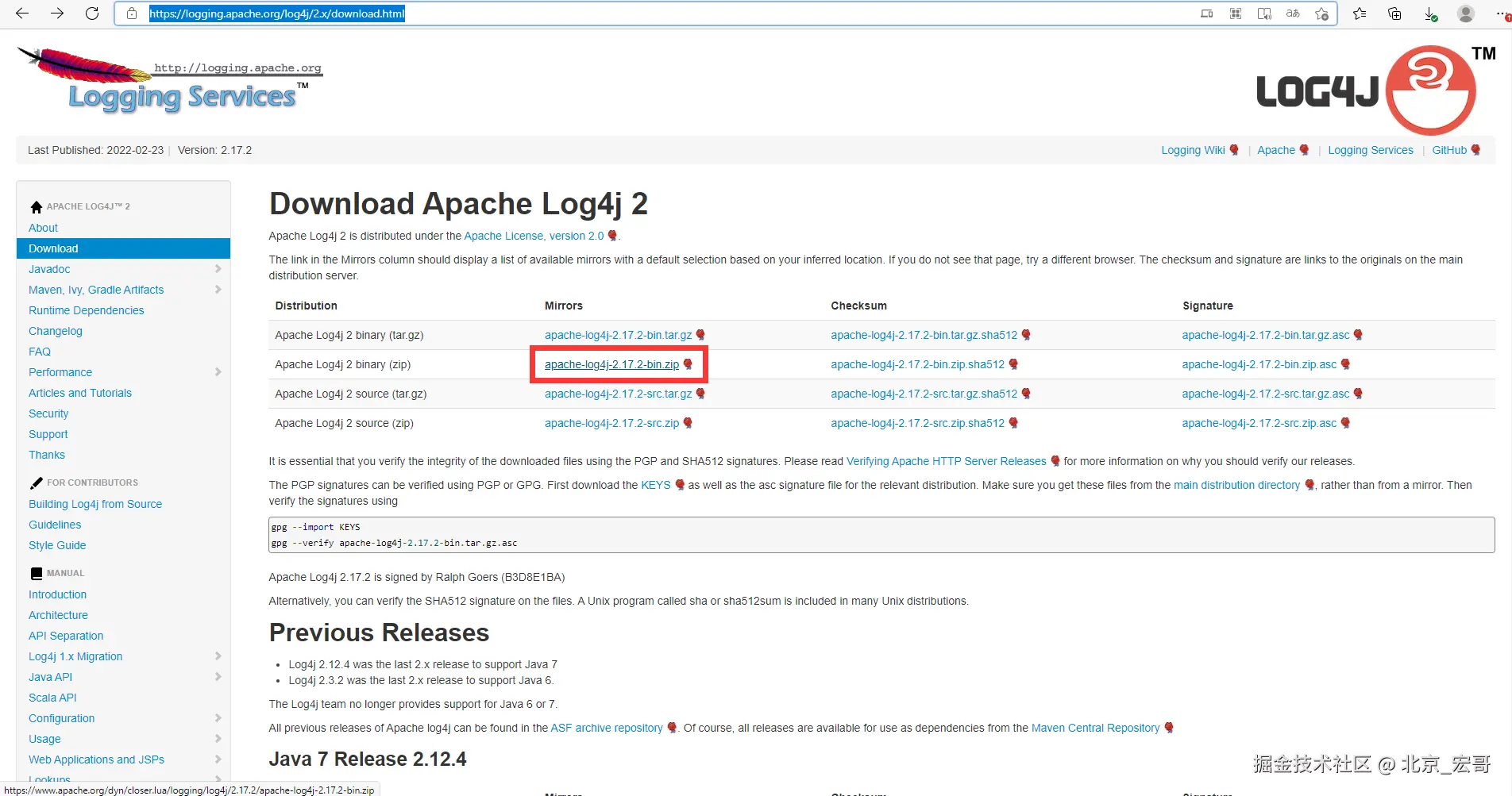 1.下载地址:logging.apache.org/log4j/2.x/d… 宏哥可以通过下载地址下载最新版本是2.17.2。如下图所示: