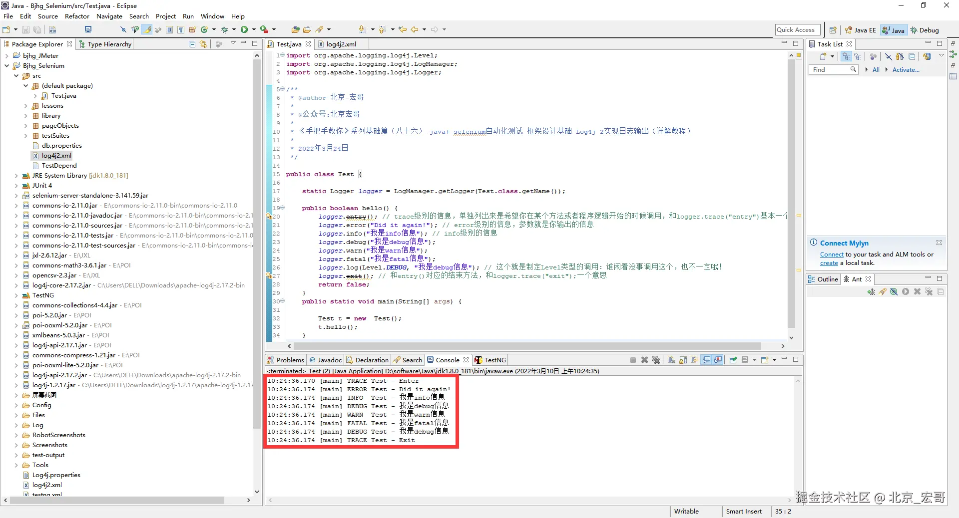 1.在这里宏哥随便写个测试类,调用就是这么简单,log4j的核心在配置文件上。如下图所示: