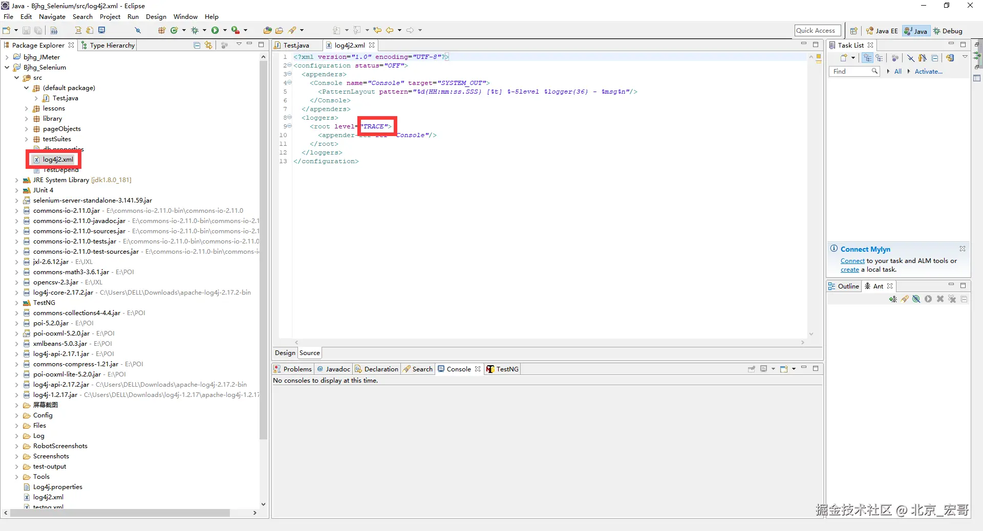 1.宏哥自己新建一个xml文件放在SRC目录下,即根目录下。命令为log4j2.xml,定义好了日志,把日志级别改成了TRACE,如下图所示: