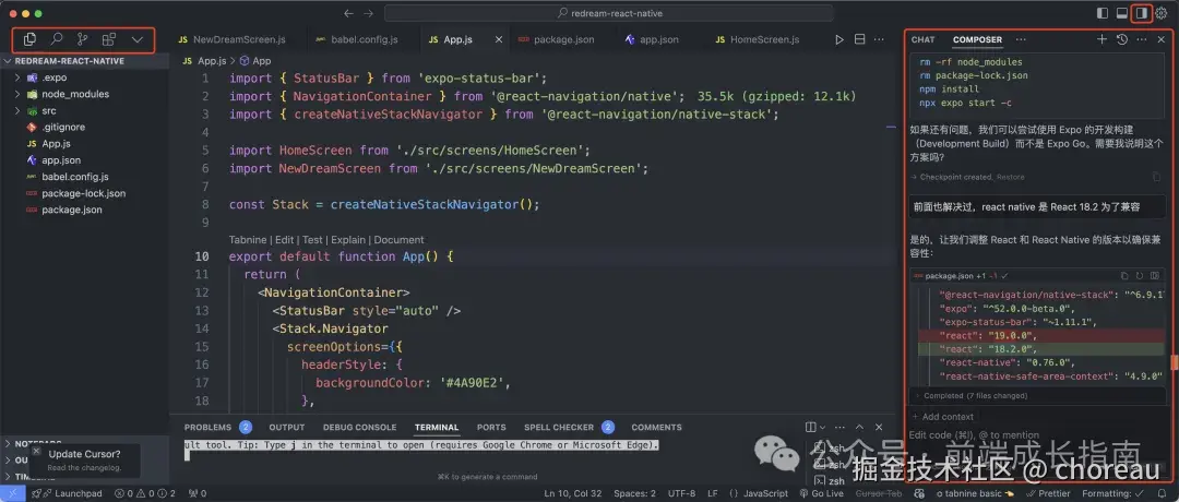 我就直接使用了,也没有什么技巧,新建一个项目文件夹,在对话 composer 中:使用最新的 React Native 技术栈,做一个记录梦的 App。cursor 简单分析了需求,就开始生成文件了,我只需要接受文件或重新生成。