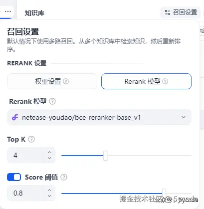 TopK 代表按相似分数倒排时召回分段的最大个数。TopK 值调小,将会召回更少分段,可能导致召回的相关文本不全;TopK 值调大,将召回更多分段,可能导致召回语义相关性较低的分段使得 LLM 回复质量降低。召回阈值(Score)代表允许召回分段的最低相似分数。召回分数调小,将会召回更多分段,可能导致召回相关度较低的分段;召回分数阈值调大,将会召回更少分段,过大时将会导致丢失相关分段。