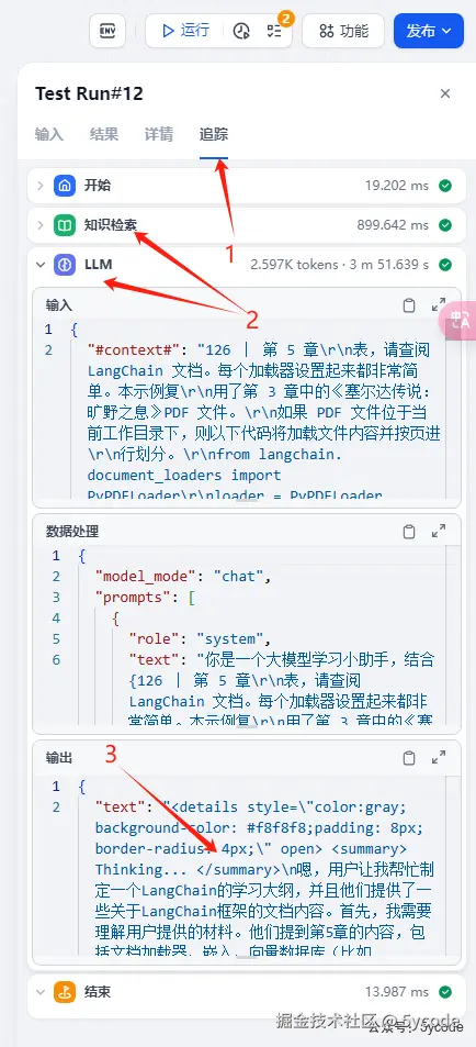 1,可以看到各个节点的执行明细2,可以看到大模型数据结果3。
