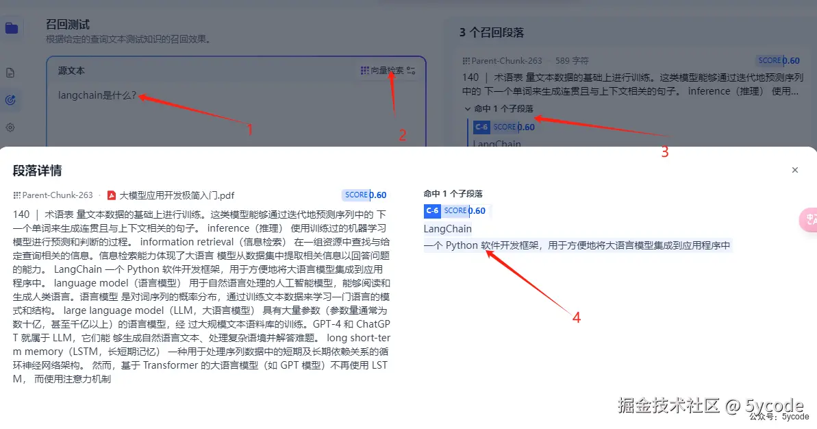 1我们输入测试问题2设置检索方式3我们可以看到匹配到的内容以及socre,点击查看详情4