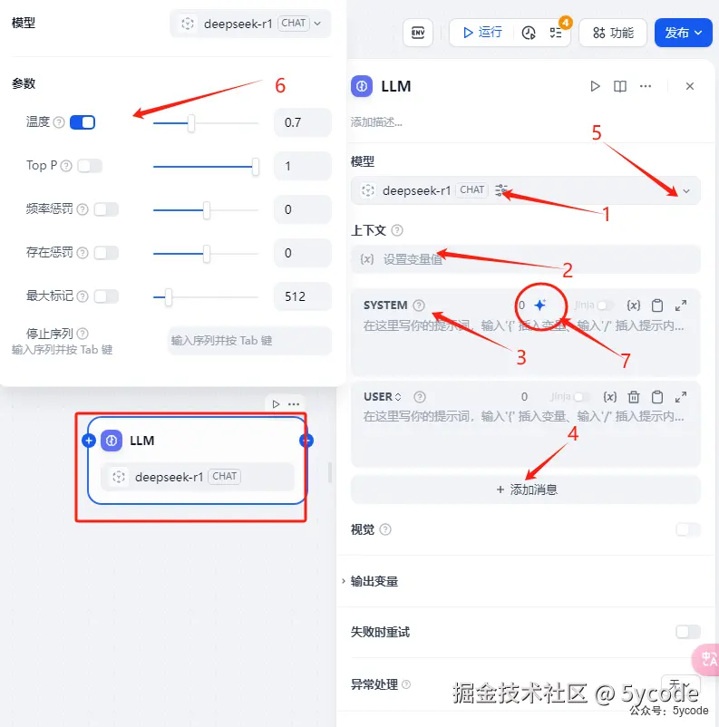 提示词:在 3的位置,默认只有一个SYSTEM提示词,我们可以通过4添加消息,来添加USR提示词和ASSISTANT提示词。提示词中我们可以通过{获取变量,通过/获取上下文,