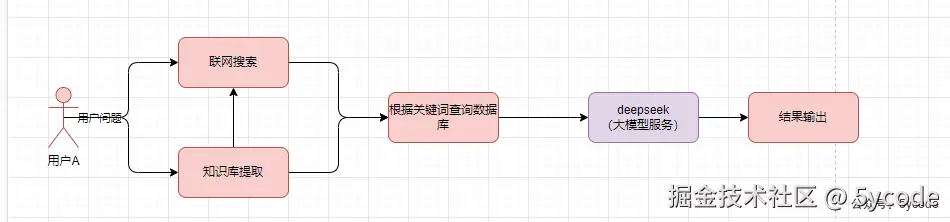 - 1,用户输入问题-> 大模型提炼关键词->然后查询数据库->将结果和问题给大模型->输出结果