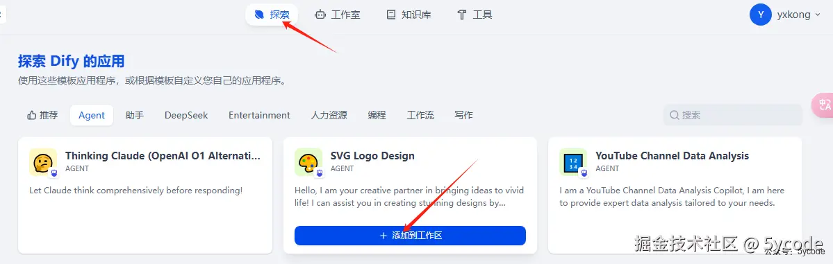 在这个模块里,dify给我们内置了一些应用模板,以降低我们的学习使用成本。按照分类已经帮我们罗列好了,我们可以点击对应的分类查询,看中哪个鼠标放上去,点击添加到工作居即可。