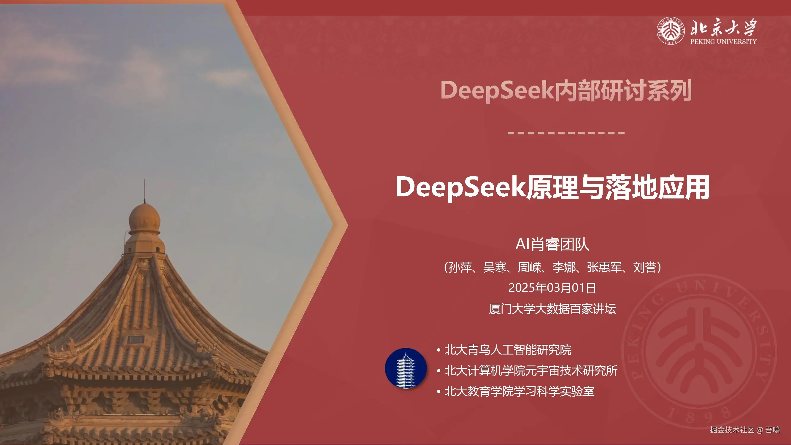 今天吾鳴要给大家分享由北京大学出版的第四份教程——《DeepSeek原理和落地应用》,教程一共57页PPT,文末有完整版下载地址。