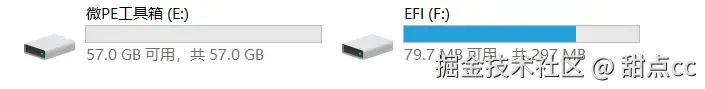 安装完成之后,可以发现U盘被分成了两个磁盘,一个是EFI(有些电脑上直接隐藏了),另一个是空磁盘(存放win10 iso文件,平常可以当作u盘正常使用)