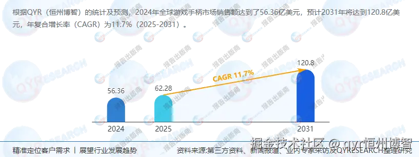 根据QYResearch最新调研报告显示,2024年全球游戏手柄市场销售额达到了56.36亿美元,预计未来几年将持续增长,到2031年将达到120.8亿美元,年复合增长率(CAGR)为11.7%(2025-2031)。