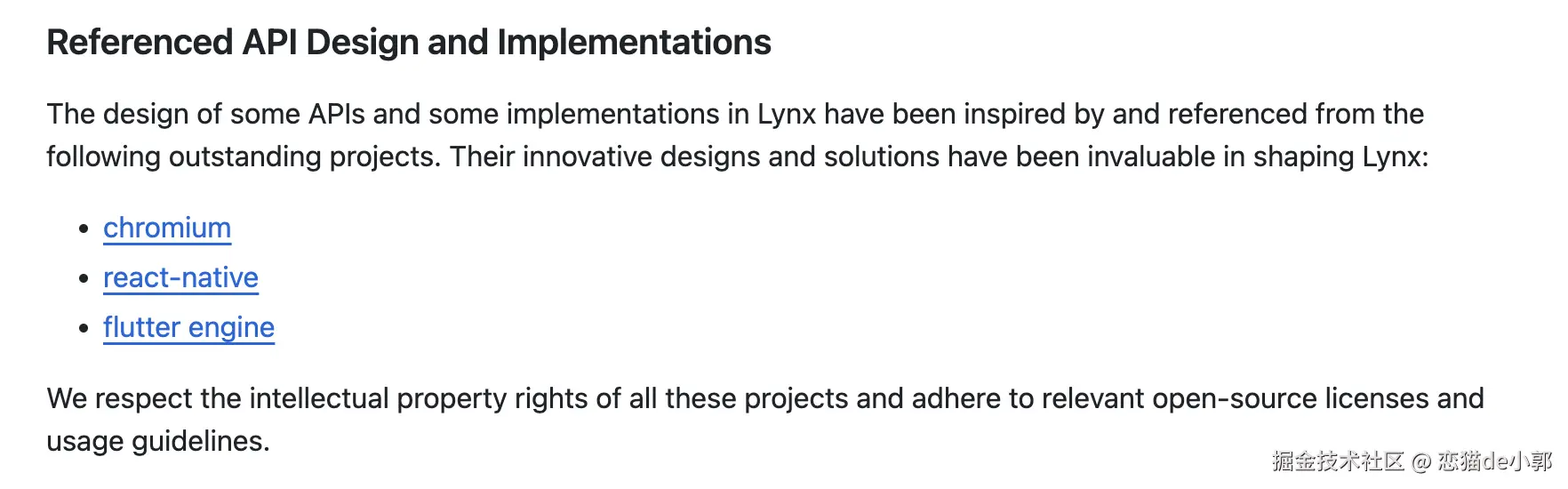 事实上,Lynx 官方并没有避讳从其他框架里学习相应优势的情况,官方就很大方的表示,Lynx 项目就是使用了 react-native 和 Flutter 的部分优势能力,从这一点看Lynx 还是相当真诚的: