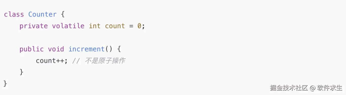 - 不能保证原子性(i++ 仍然需要 AtomicInteger 或 synchronized)