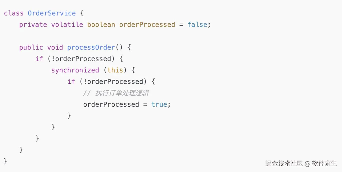 这里 volatile 主要确保多个线程能及时看到 orderProcessed 变量的变化,避免多个线程重复处理同一个订单。