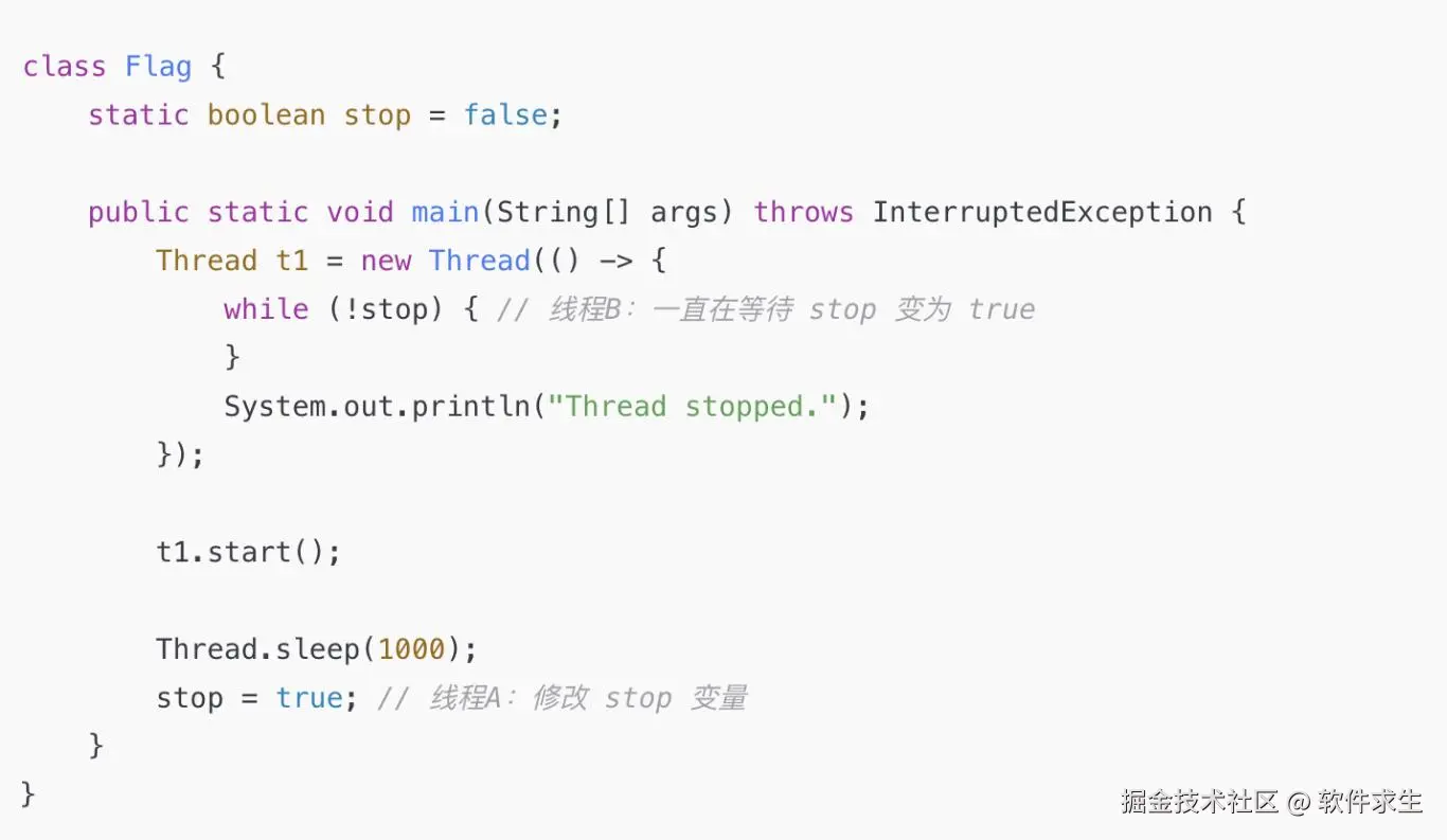 因为 Java 内存模型(JMM)中,每个线程都有自己的工作内存(线程本地缓存) ,如果一个变量没有被 volatile 修饰,线程 B 可能一直使用自己缓存的 stop,而不是去主内存获取最新值。