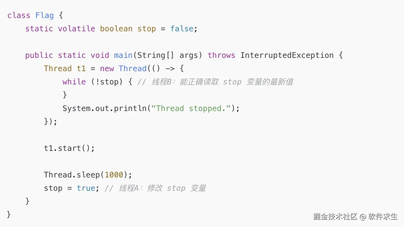 有了 volatile,线程 A 修改 stop,线程 B 就能立刻感知到变化,不会死循环了!