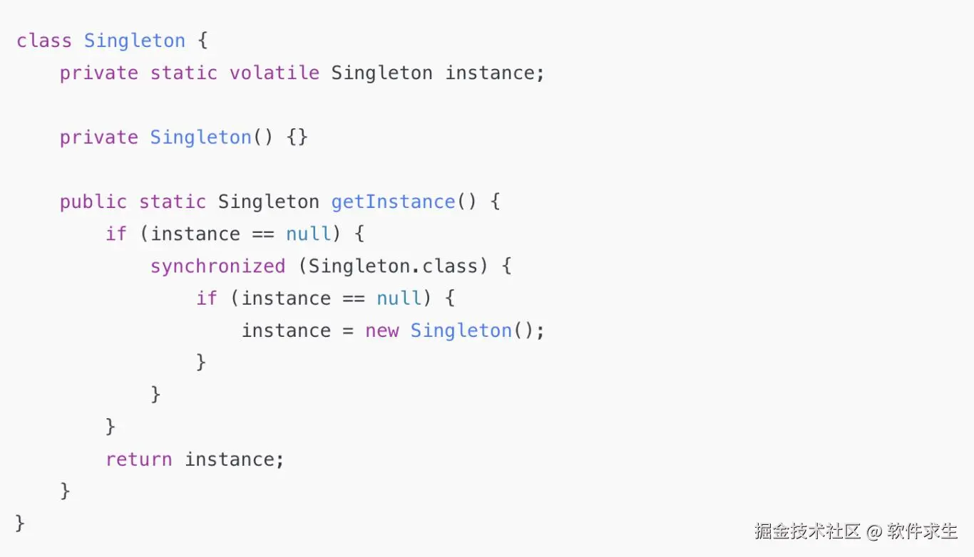 加上 volatile,可以防止这个指令重排问题,确保 new Singleton() 的顺序是严格按照分配内存 -> 执行构造方法 -> 赋值的顺序进行。