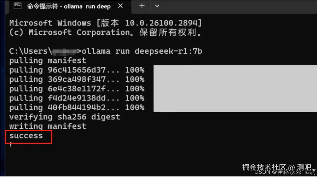 - 执行下载:打开命令行工具,粘贴并执行下载命令。下载过程可能需要较长时间,取决于模型大小和网络速度。当你在命令行看到success的时候说明DeepSeek已经安装成功了,但现在只能在终端使用这种命令行的方式进行对话,体验不好,所以我们需要借助一些第三方工具,实现官网种的对话样式