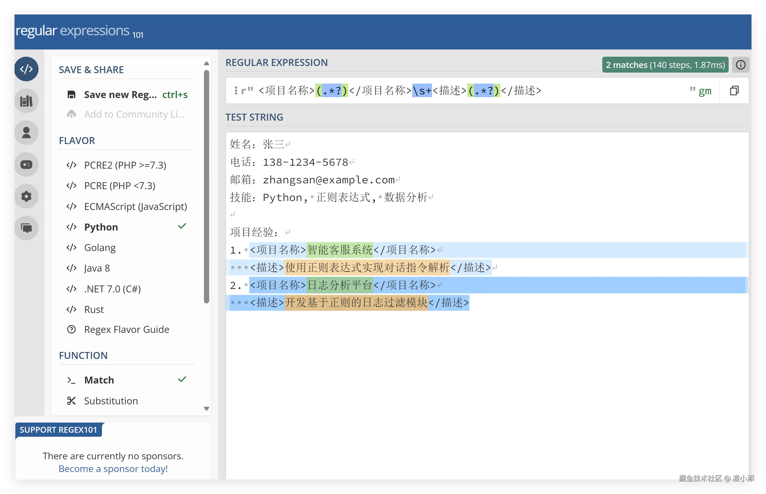 注意调试和优化 :在编写复杂的正则表达式时,要注意调试和优化,避免出现错误和性能问题。可以使用在线测试工具如 regex101.com 进行调试和测试。