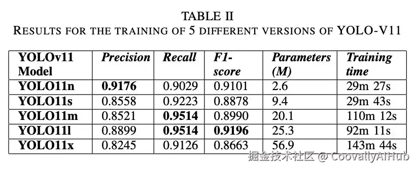 YOLO-v11有五种不同类型的模型,即YOLO11n、YOLO11s、YOLO11m、YOLO11l和YOLO11x。所有五个模型都在上一节详述的两个数据集版本上进行了训练。训练时间为200 epochs。早期停止训练的耐心时间为20 epochs。使用AdamW作为优化器。训练所用的训练参数详见表 1。对于 YOLO11x,为了避免谷歌实验室GPU内存的限制,使用了8个批次。
