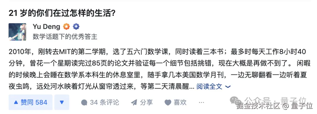 据邓煜本人在知乎介绍,他转到 MIT 的第二个学期,选了五六门数学课,同时读着三本书,最多时每天工作 8 小时 40 分钟,曾花一个星期读完过 85 页的论文并验证每一个细节包括挑错……