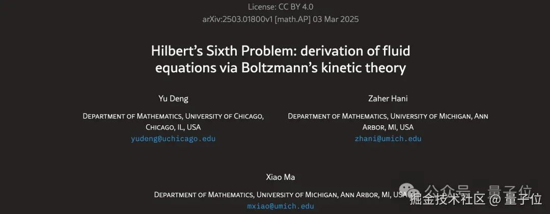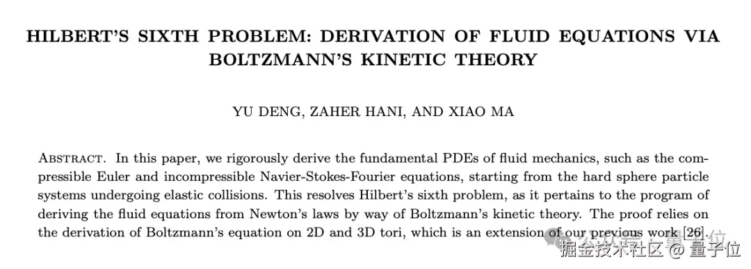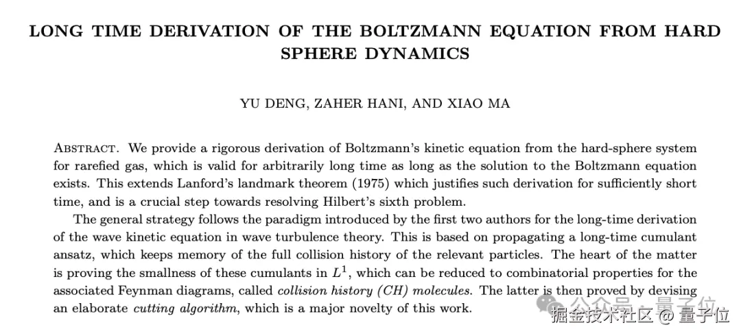 直到去年,邓煜等三人联手,用一篇 164 页的论文,从稀薄气体硬球系统严格推导了玻尔兹曼动力学方程,使得希尔伯特第六问题的解决之路又向前迈进了一大步。