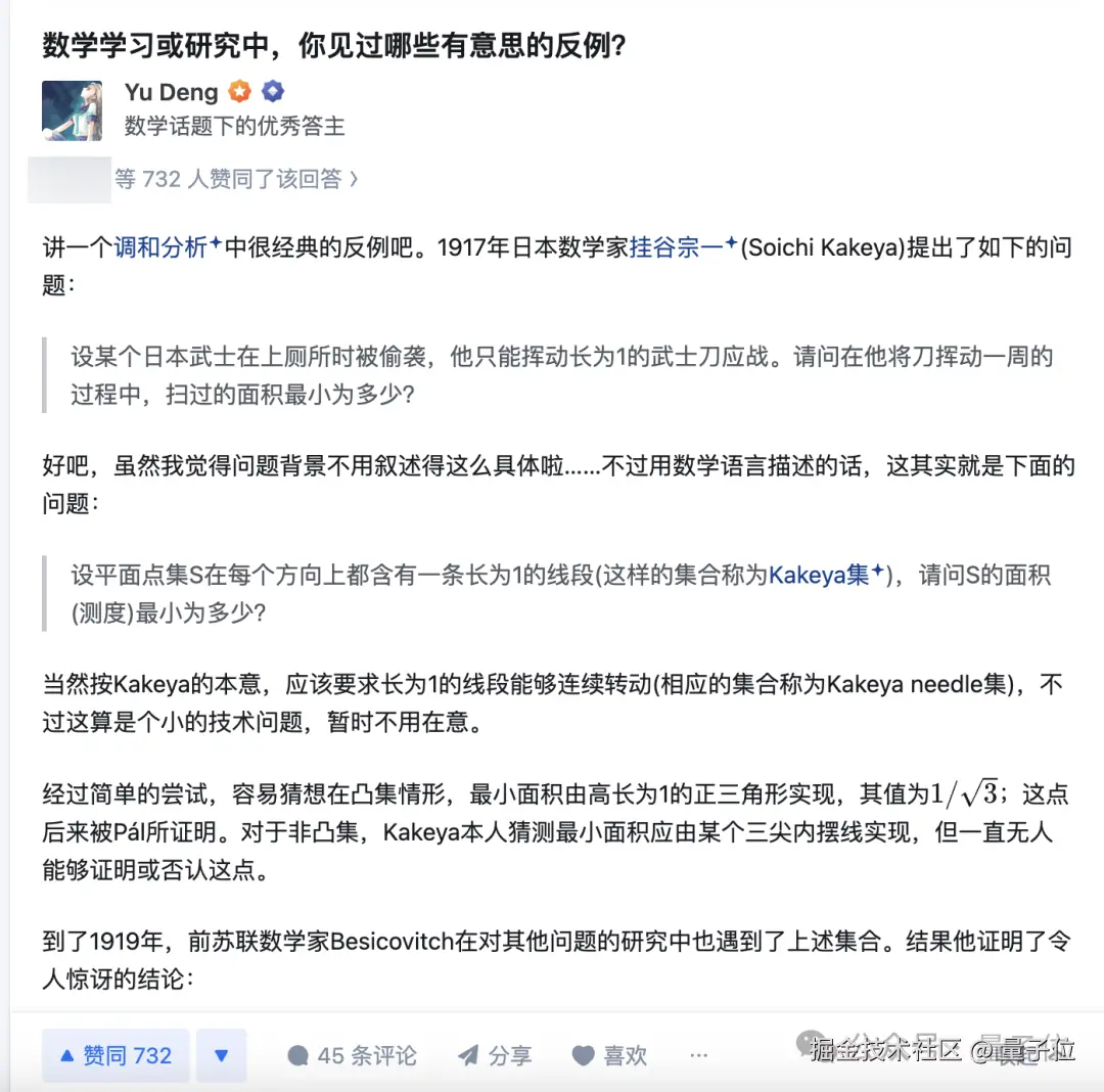 有趣的是,关于前段时间刚被破解的挂谷猜想,邓煜也在知乎写过一篇科普文章。