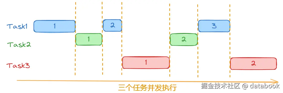 并发(concurrency)执行的情况如下,三个任务交替执行,感觉像是同时在运行。