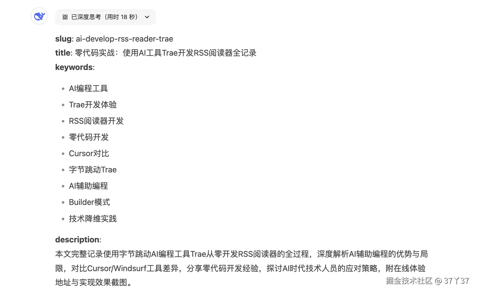 写好文章丢给GPT,再配上一段提示词,GPT就能根据文章的内容生成SEO友好的slug、title、keywords和description等信息,例如我把上篇文章「 全程使用 AI 从 0 到 1 写了个小工具」的内容丢给DeepSeek,让他从SEO友好的角度生成文章的TDK等信息