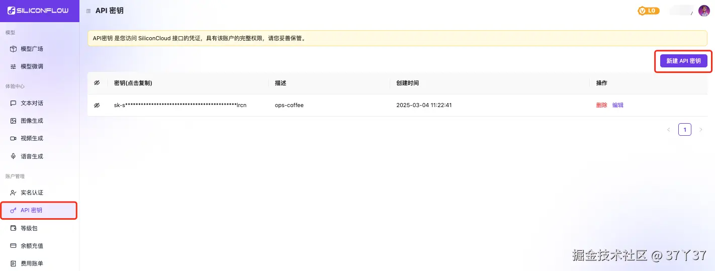 首先去注册平台账号并登录,登录之后点击页面左侧的API密钥-新建API密钥,填写描述信息了之后就创建了一个API密钥