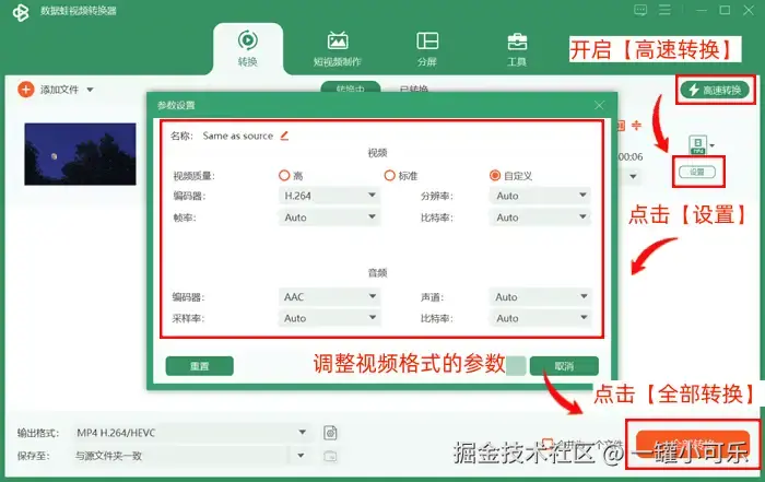 第三步:开启【高速转换】功能,并点击【设置】按钮调整视频格式的参数,最后点击【全部转换】即可。