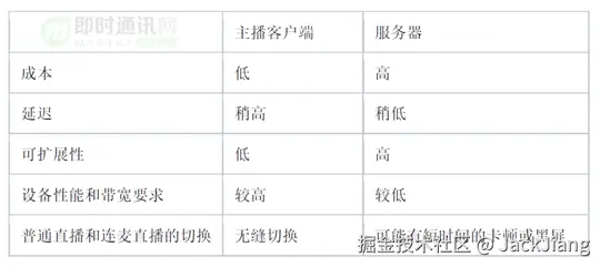 主播客户端需要等待服务器把对方的流发送过来才能混流,所以从延迟的角度来看服务器混流稍微占据优势,不过这个延迟相比CDN的延迟可以忽略不计。如果后期对通话质量要求变高,主播的设备性能和上行带宽跟不上,我们可以很容易增加服务器来扩展计算资源和带宽,所以在可扩展性方面服务器混流胜出。