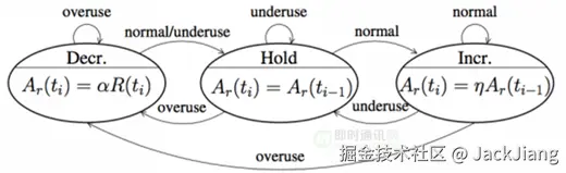 基于延迟的评估算法包括Transport-CC和Goog-REMB,目前最新版的WebRTC默认使用的是Transport-CC。Transport-CC在发送端进行带宽评估,接收端通过TransportFeedback RTCP包向发送端反馈每个RTP包的到达时间,发送端在一个时间窗口内计算每个RTP包到达时间与发送时间之差,通过Trendline滤波器处理后预测网络状况。假设我们当前处于Hold状态,如果检测到网络状态为OverUse,此时应该减小数据量,变更为Decrease状态;如果检测到网络状态为Normal,此时可以尝试增加数据量,变更为Increase状态。