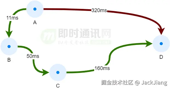 实时音视频对网络的要求非常高,如果通话双方距离很远,那么通话质量是很难保证的。城市A的设备给城市D的设备发送数据,直接发送未必是最优的选择,从城市B和城市C中转一下有可能更快。