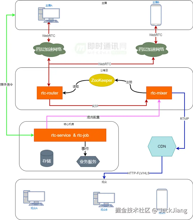 rtc-mixer负责混流,根据需求拼接画面和混音,然后推送到CDN,观众通过CDN拉流。