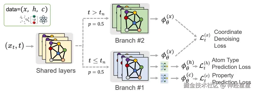 然而,研究人员观察到,过采样可能导致整个时间步长范围内的训练不平衡,进而影响生成过程的质量。为了解决这个问题,其提出了一种多分支网络架构。该网络在浅层共享参数,但在更深的层次分裂成两个分支,每个分支拥有一套独立的参数。这些分支在训练的不同阶段激活:一个分支专注于成核阶段,另一个分支处理生长阶段, 如下图所示。该设计确保了预测任务和生成任务能够有效训练,而不会相互影响。