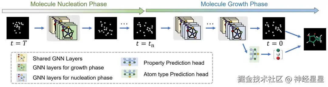 研究人员将分子生成过程分为两个阶段 ,即「分子成核阶段」和「分子生长阶段」, 这一划分灵感来源于物理学中的晶体形成过程。