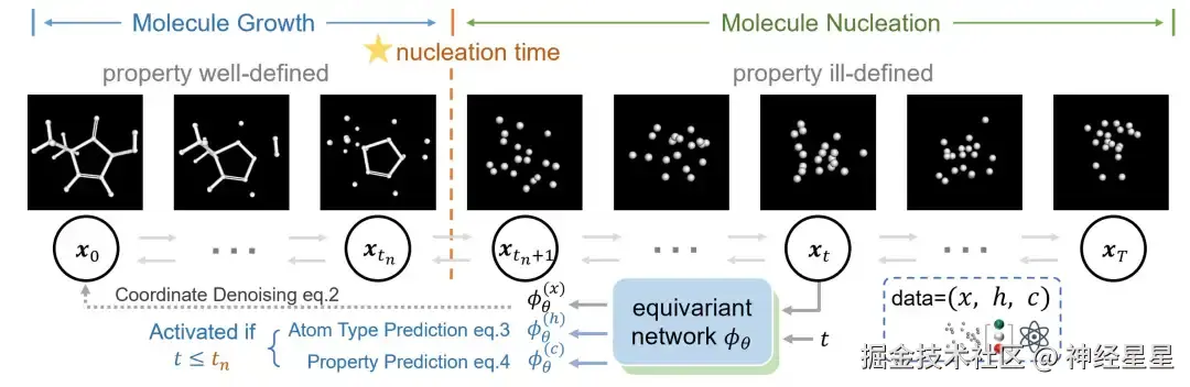 不同于传统生成模型通常进行原子类型和坐标的联合扩散,这一创新方法仅专注于坐标的扩散,将原子类型作为单独的预测任务。 因为研究人员观察到,原子类型通常可以根据成型的分子坐标推断出来。具体来说,在成核之前,扩散过程的目标是重建坐标;成核之后,其将原子类型和性质的预测损失整合进统一的学习框架中。