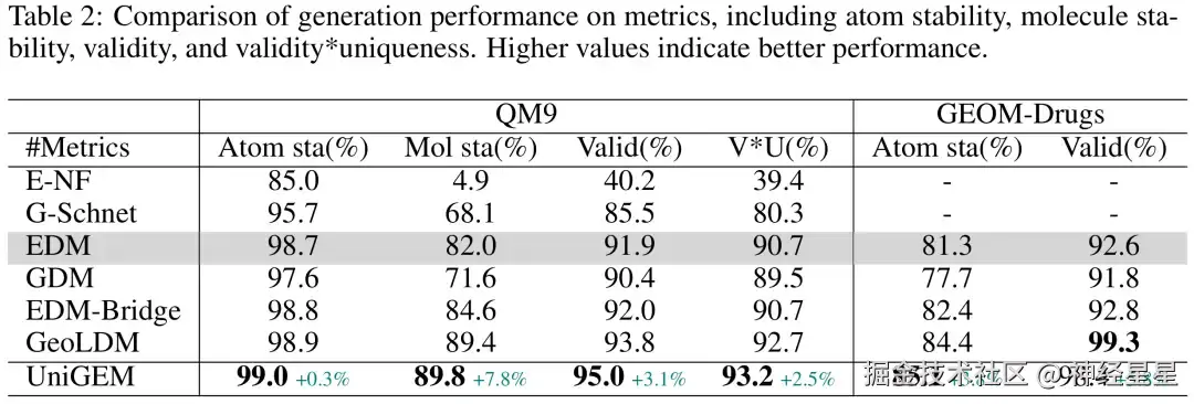 研究人员首先在 QM9 和 GEOM-Drugs 数据集上比较了基于 EDM 改造的 UniGEM 与 EDM 变体,UniGEM 几乎在所有评估指标上都优于基准模型,如下图所示。值得注意的是,与其他 EDM 变体相比,UniGEM 显著更简单,因为它既不依赖于先验知识,也不需要额外的自动编码器训练,但它的性能优于 EDM-Bridge 和 GeoLDM,突显了 UniGEM 的优势。