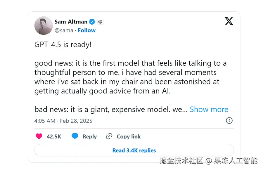 这个就很有意思了,因为 OpenAI 最近发布的这个 GPT-4.5,大概就是 GPT-4o 成本的 30 倍: