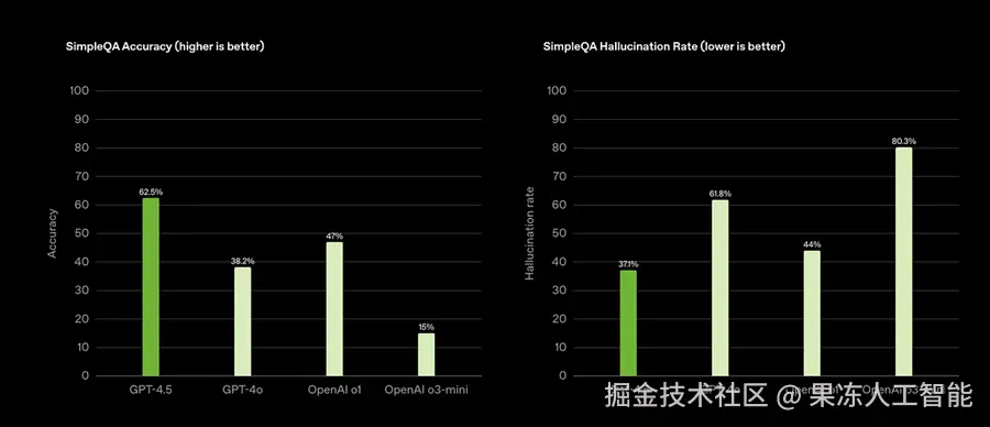 他们只展示了这些图,这让我怀疑 GPT-4.5 在很多方面其实打不过 GPT-4o。而且有意思的是,这些图里根本没包含 o3 reasoning 模型,只放了 o3-mini。
