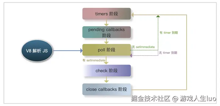 轮询等待新的链接和请求等事件,执行 I/O 回调等。V8 引擎将 JS 代码解析并传入 Libuv 引擎后首先进入此阶段。如果此阶段任务队列已经执行完了,则进入 check 阶段执行 setImmediate 回调(如果有 setImmediate),或等待新的任务进来(如果没有 setImmediate)。在等待新的任务时,如果有 timers 计时到期,则会直接进入 timers 阶段。此阶段可能会阻塞等待
