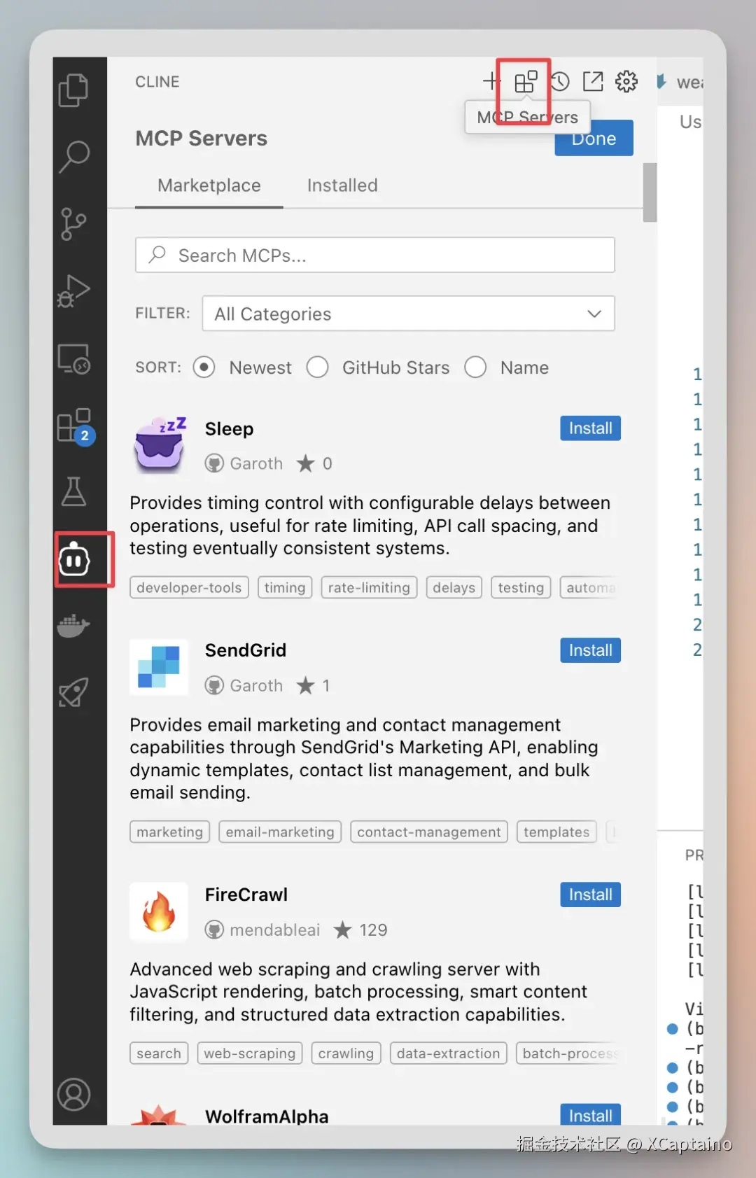如果用VS code + Cline,点击这里可以搜索MCP server,选择安装。