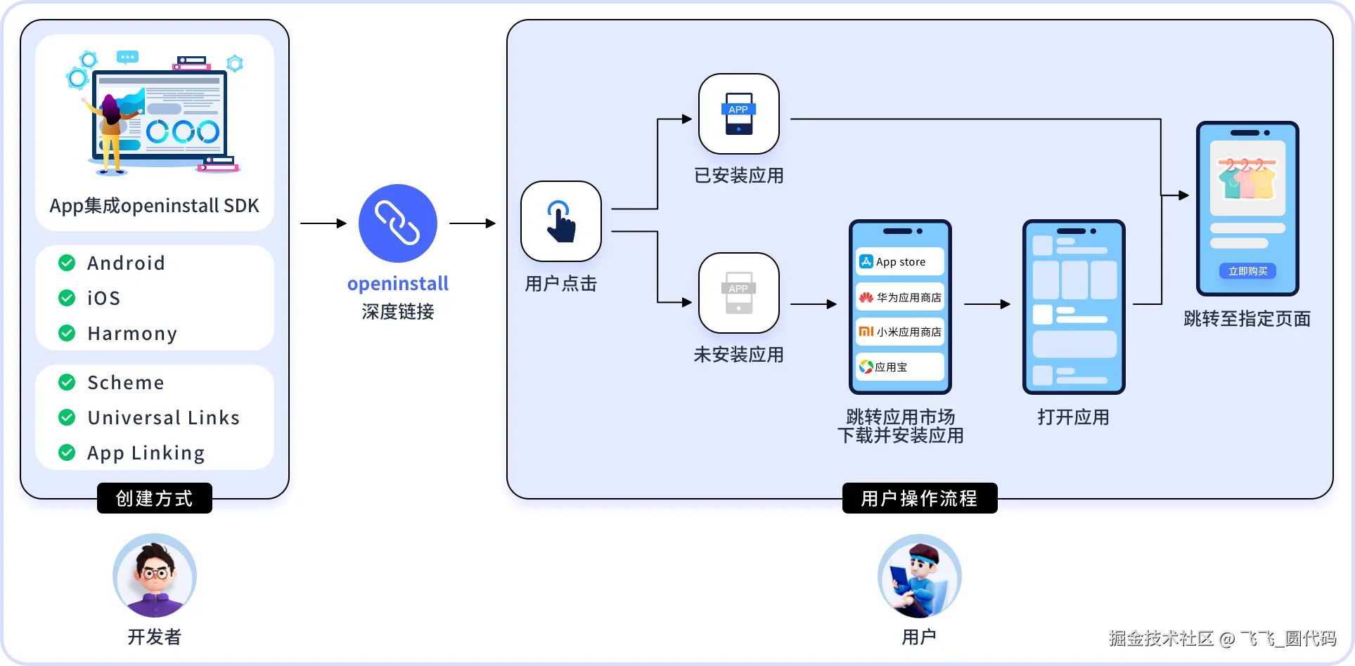 - 用户路径:点击按钮→已安装用户直接跳转App内对应页面;未安装用户引导下载→安装后首次打开自动跳转目标页。