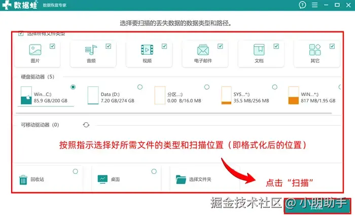 步骤1: 在电脑打开数据 蛙恢复专家,在主页面按照指示完成选择后,点击“扫描”;