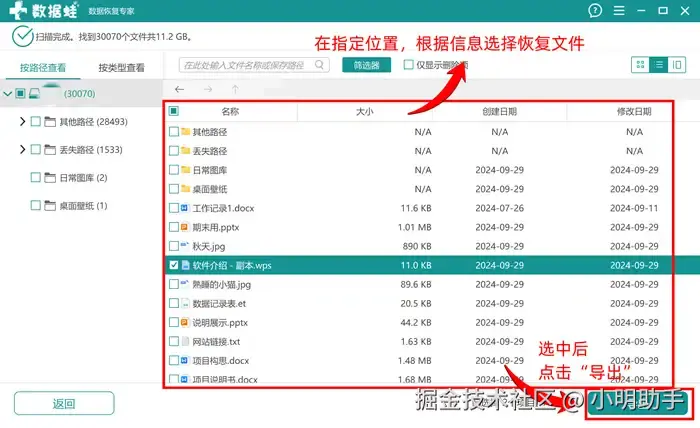 步骤2: 软件完成扫描工作后,用户就能够在指定位置上勾选出自己需要恢复的文件(可以选择多个文件),选好后点击“导出”;