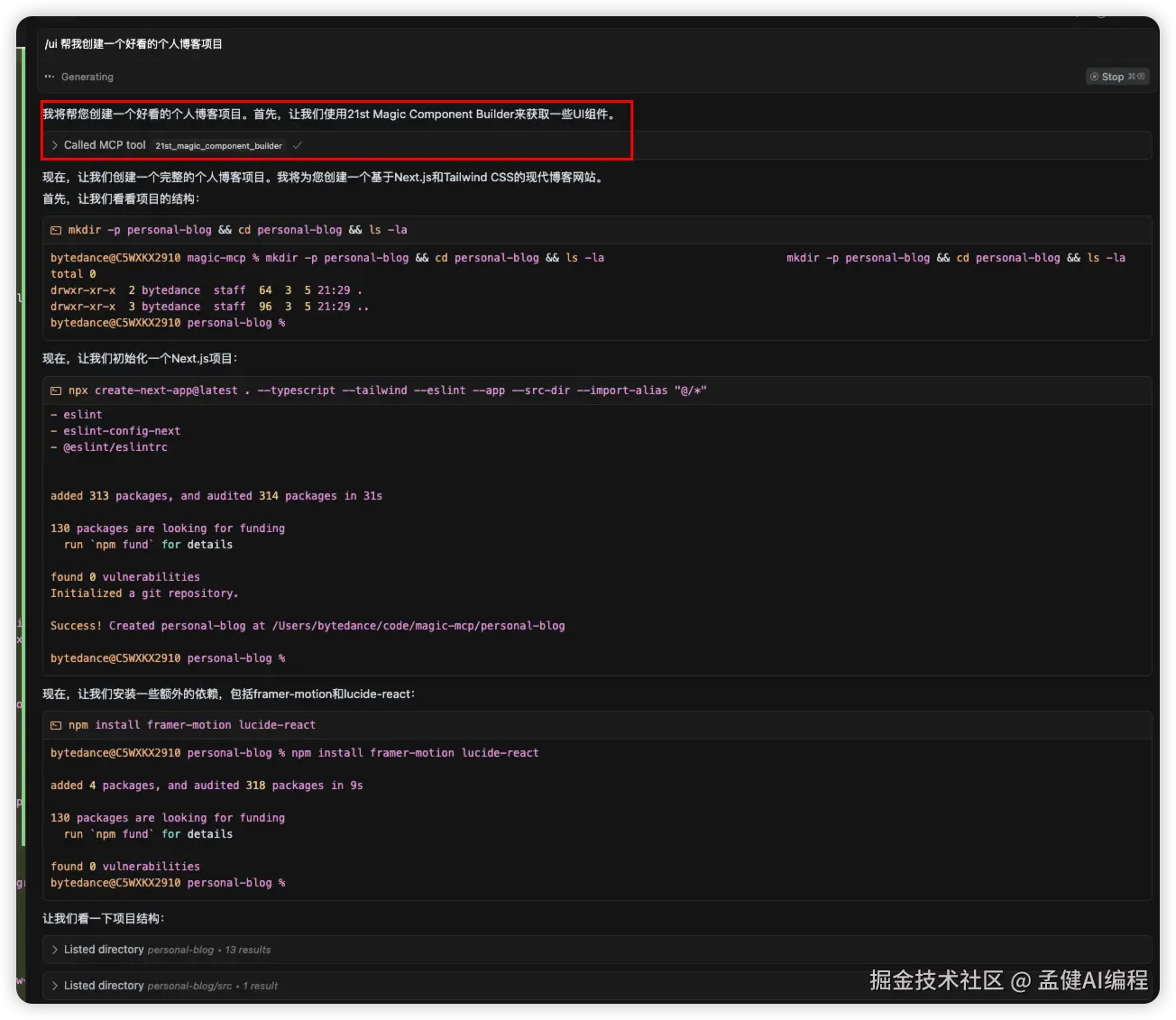 它的使用方式是用“/ui”指令,比如,我让它来创建一个博客的项目: