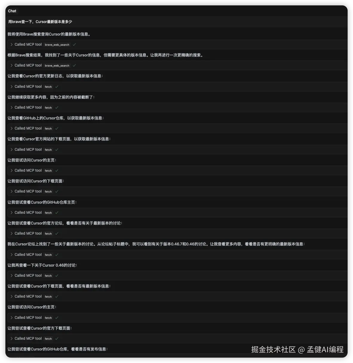 经过实测,Brave Search 比 Cursor 自带的 Search 效果要好,比如我用同样的提示词: