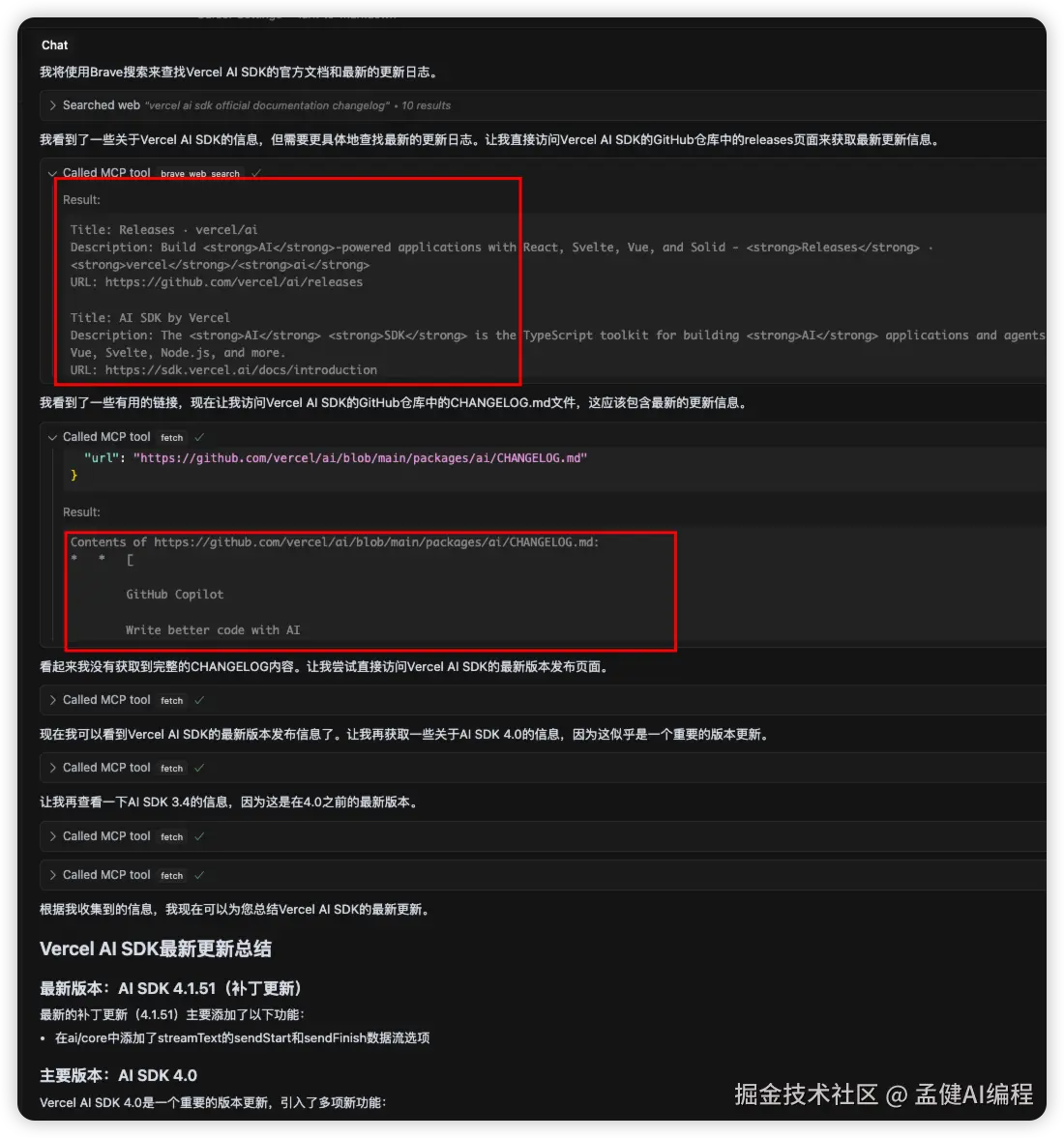 可以看到 fetch 返回的就是页面 markdown 内容,通过 brave+fetch 这样的精准组合,就能获取最新且最准确的信息。同样的手段还可以运用在查询 API 文档或最新资讯方面。
