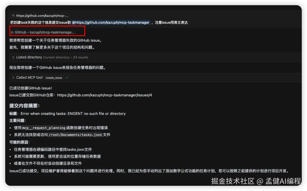 Github MCP 允许直接调用 Github 的 OpenAI 能力,甚至可以直接提交 issue。我刚好在使用 TaskManager、Playwright 这两个 MCP 服务的时候,遇到异常,于是顺手就用 Github 的 MCP 提交了一个 issue: