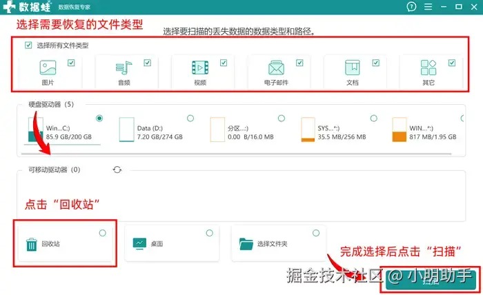 第1步:打开软件,在主页面上选择需要恢复的文件类型和回收站,选好后再点击“扫描”;